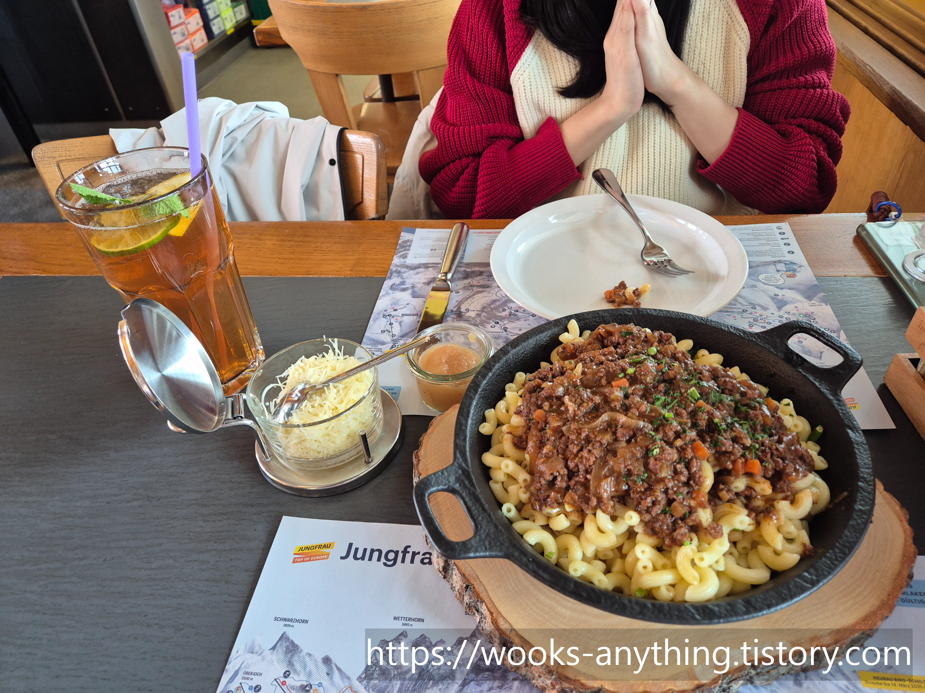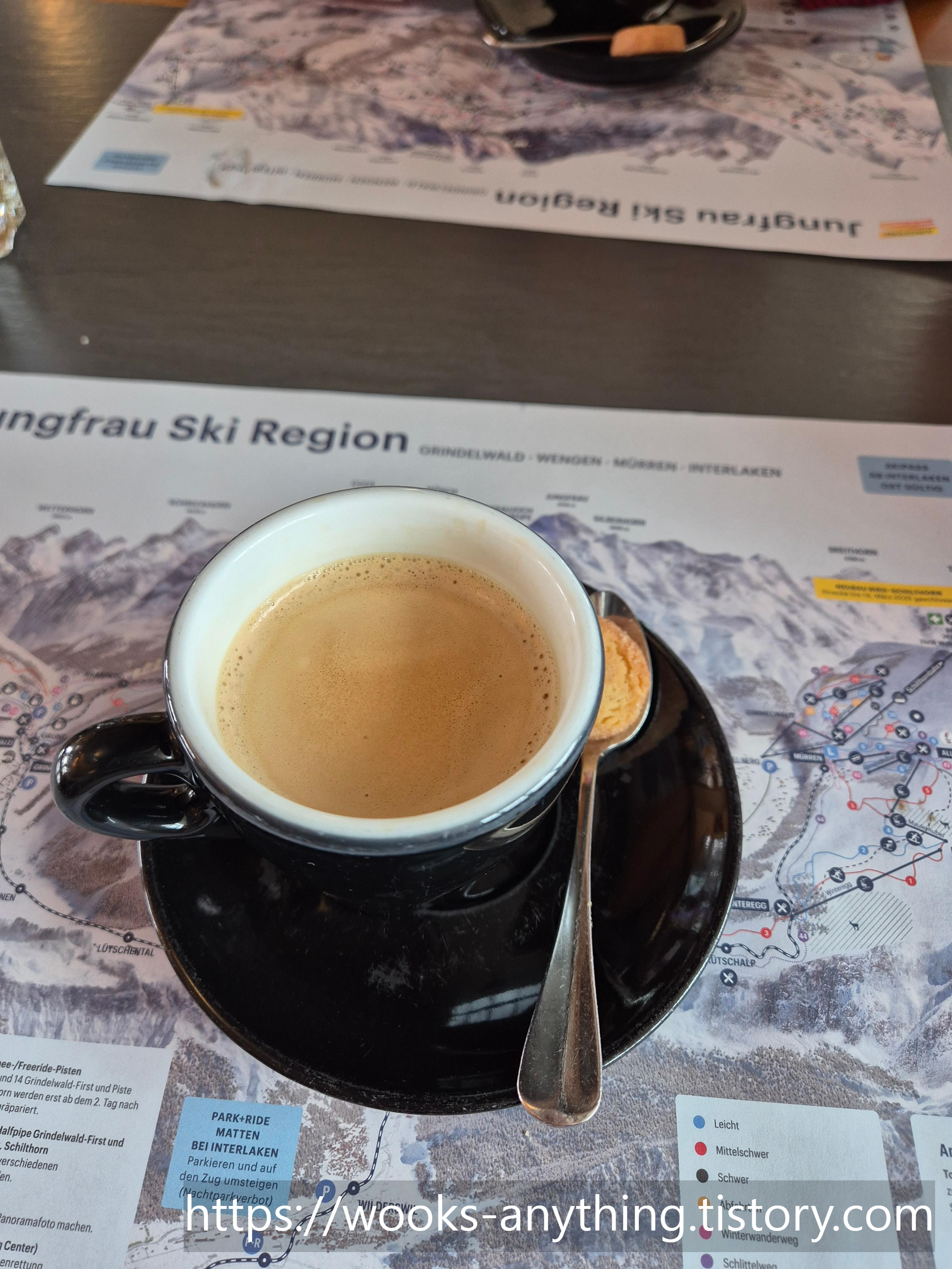 오늘 하루종일 먹은게 컵라면밖에 없다는 와이프의 말에 클라이네 샤이덱에서 내려 식당에 들렸다. 점원분께서 굉장히 친절하셨는데 음식 두개를 시켰지만 하나만 나왔다. 뭔가 소통에 오류가 있었나보다. 하지만 오히려 좋았다! 음식 하나만 해도 양이 많아서 남기고 커피 한잔 마신 후 기차를 타고 그린델발트 역 까지 바로 갔다.