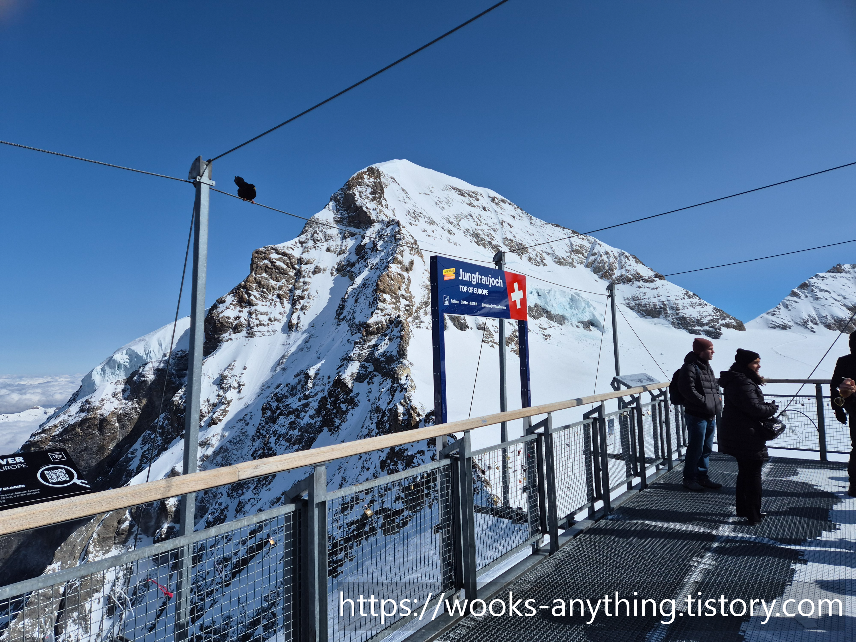 융프라우에 도착하면 얼음동굴을 지나 이곳저곳 구경하면서 다니게 되는데, 사람들 사진 많이 찍는 스위스 국기가 있는 장소가 나올때까지 모두 다 들러봐야한다. 바람이 엄청 불고 Top of Europe 적혀있는 곳에서 사진을 찍고 나와서 이제 얼른 내려가자고 하며 가다가 사람들이 내려오는 어떤 계단을 발견했는데, 가본 곳인줄알고 힘들어서 안가려다가 혹시나 싶어 가보니, 사람들이 사진 많이 찍는 장소였다.